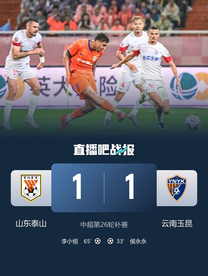 中超第26轮补赛,山东泰山主场1比1憾平云南玉昆。侯永永和李小恒各入一球,郑铮射门击中门框,差点成为全场绝杀。
